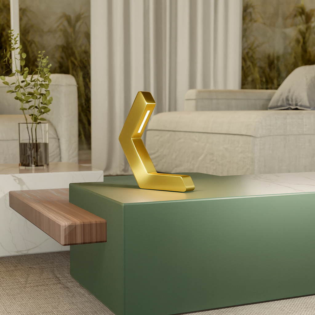This Gold Finish Oak wooden lamp is equipped with an integrated LED strip that provides a soft, ambient glow with elegant gold tone. Whether placed on your desk, bedside table, or living room shelf, it creates a cozy atmosphere while maintaining a modern aesthetic. Its angular design not only enhances light direction but also gives your space a contemporary architectural feel.