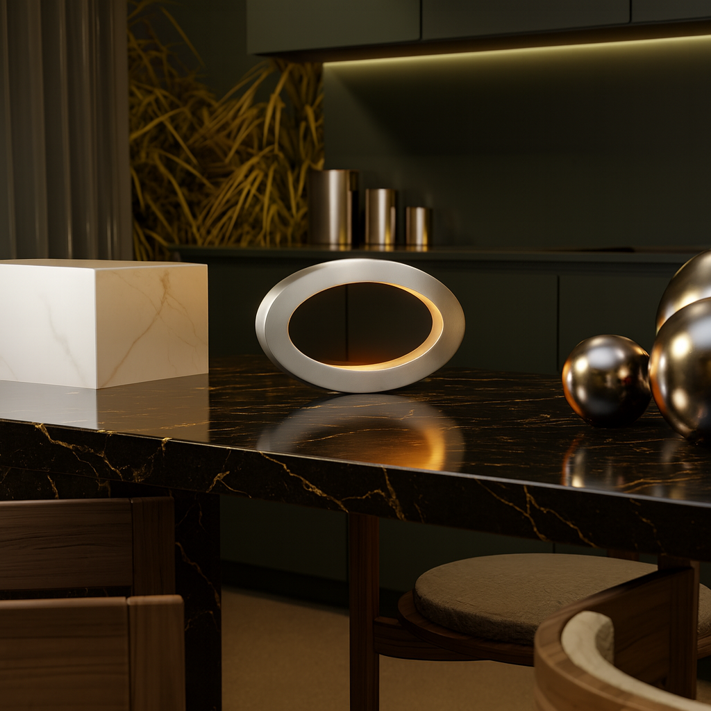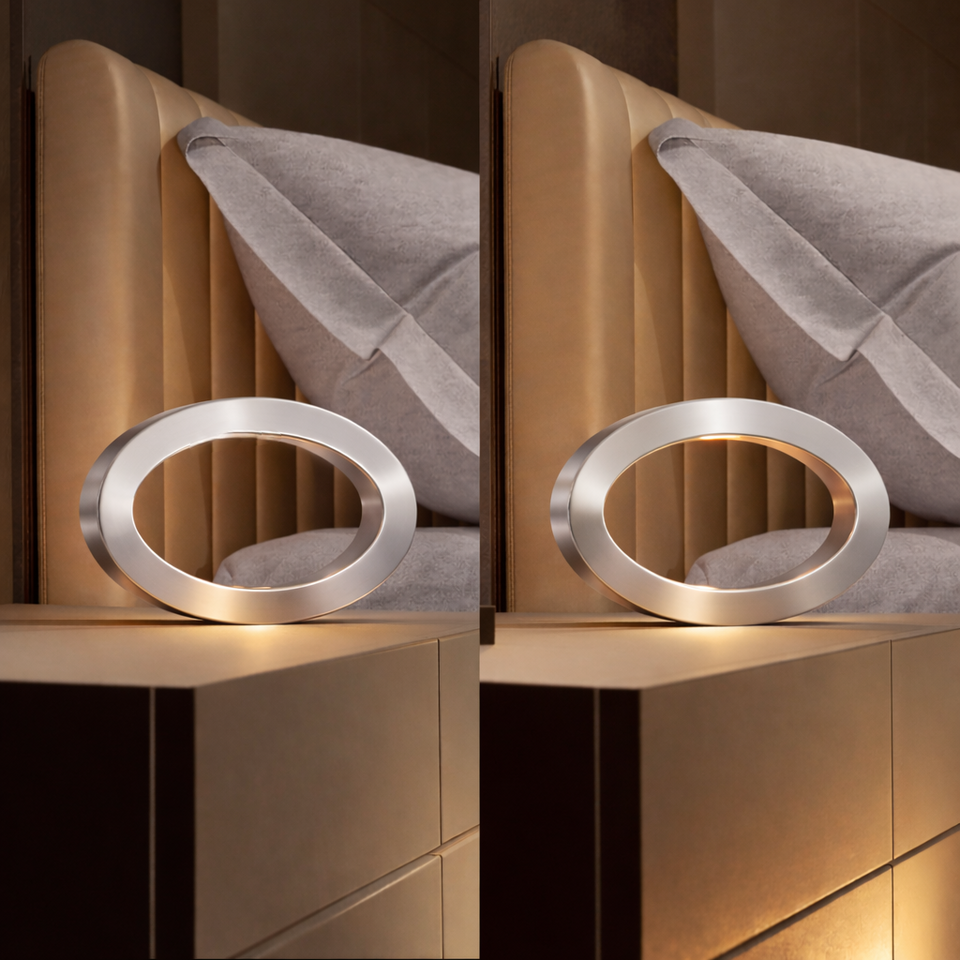 The hollow rotatable oval design creates a contemporary aesthetic that enhances any room, whether it's placed on a bedside table, office desk, or living room console. The integrated LED lighting offers a soft, warm glow with elegant silver tone that provides functional illumination without overpowering the atmosphere.