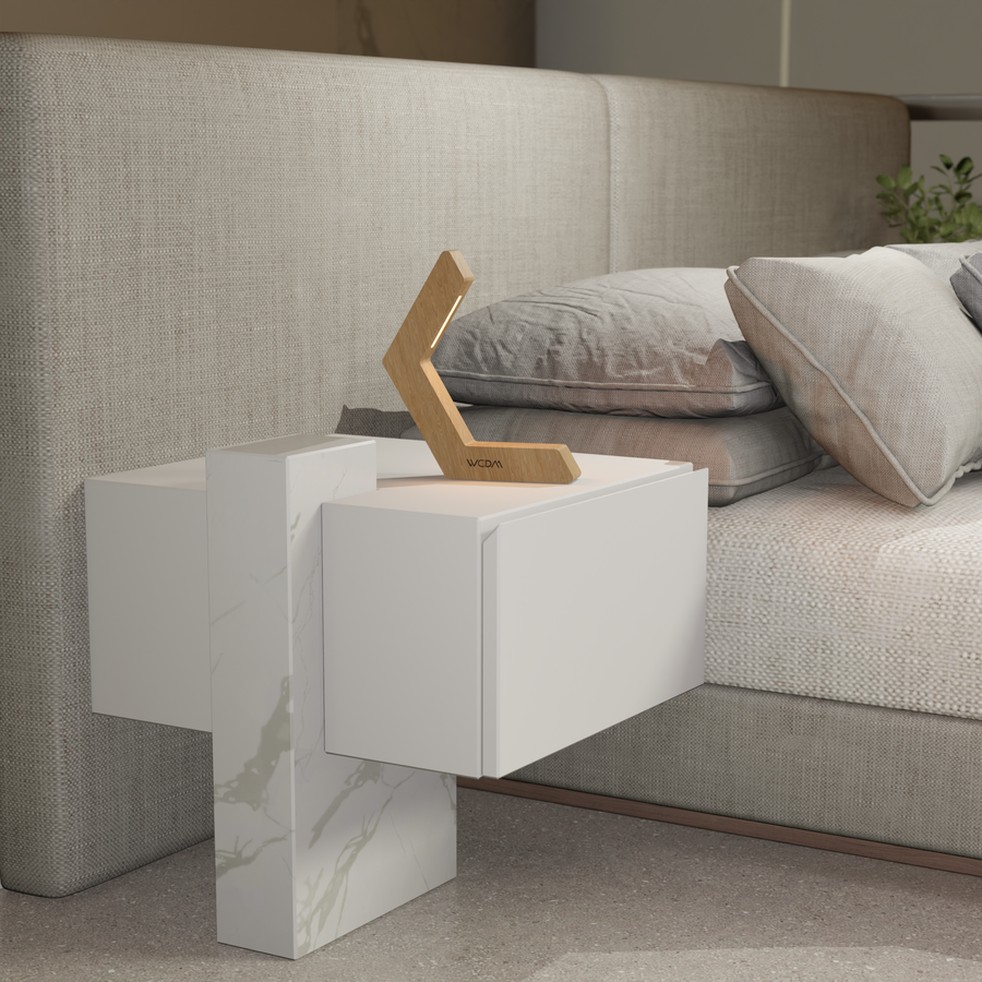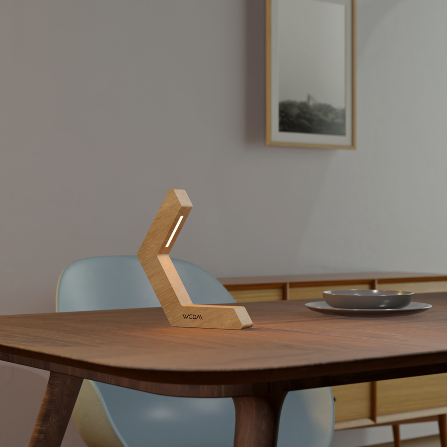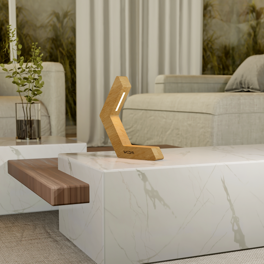 This oak wooden lamp is equipped with an integrated LED strip that provides a soft, ambient glow. Whether placed on your desk, bedside table, or living room shelf, it creates a cozy atmosphere while maintaining a modern aesthetic. Its angular design not only enhances light direction but also gives your space a contemporary architectural feel.