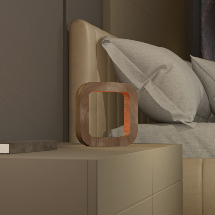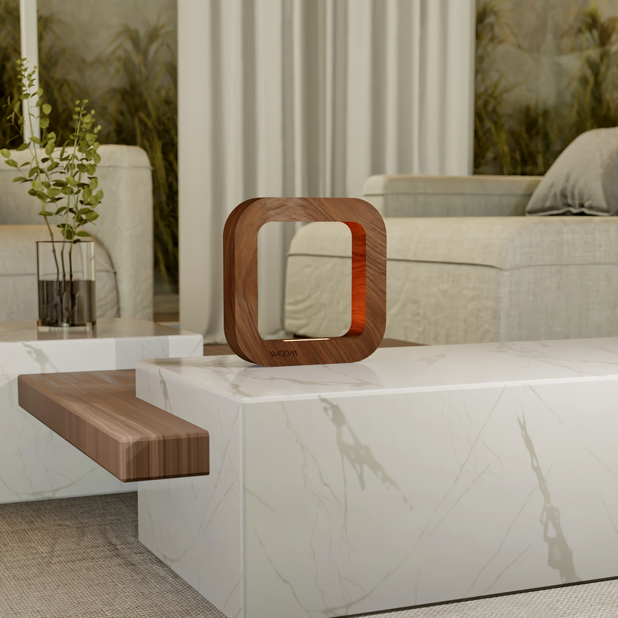 The rotatable square geometric structure gives it a strong modern appeal, while the smooth walnut grain adds warmth and natural beauty. Its integrated LED lighting provides soft illumination, perfect for bedrooms, living rooms, or offices where cozy yet stylish lighting is needed.